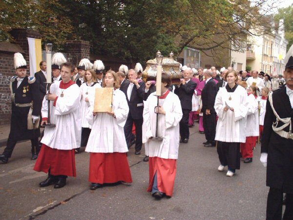 Het eind van de mis was het begin van de processie waarin de prachtige schrijn met het gebeente van Ludger vanuit de basiliek werd rondgedragen door Werden. Met de Ludgerprocessie komt Werden al sinds 1128 een gelofte van de toenmalige abt na, die inhield dat Werden uit dankbaarheid voor het afweren van een hongersnood door Ludger elk jaar zijn gebeente in processie zou ronddragen.Na afloop de ontvangst van de kerkgangers voor een lunch in het nabijgelegen Mariengymnasium. Maar daar ging het niet alleen om, het elkaar weerzien en bijpraten bleek ook dit jaar weer minstens zo belangrijk. Gerard Bomers. |