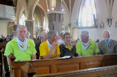 6. Zaterdag 31 augustus kwamen leden van de Bruderschaft uit Essen-Werden (foto) op bezoek in Zelhem. Het bijzondere was dat ze hier op de fiets kwamen, zoals ook met de translatio zondag 20 mei 2012. Ze komen dan met de trein naar Emmerich en vandaar nemen ze de fiets. Uiteraard werd het Ludgerkerkje bezocht en nadien hebben zij nog gezellig iets gedronken op een terras op de Markt in Zelhem, tegenover de Lambertikerk. |