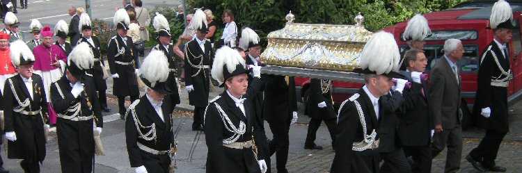 Jaarlijks Ludgerfeest met processie in Essen. Zoals elke jaar, ook nu weer het jaarlijkse Ludgerfeest in Essen-Werden op de eerste zondag van september, zondag 6 september. Als je dit niet een keer hebt meegemaakt, is er moeilijk een voorstelling van te maken. We kennen in Nederland ook wel processies, maar niet zo groots opgezet als daar. Het begint wel vroeg, nl. om 10.00 uur, met een eucharistieviering in de Ludgerusbasiliek. Dit jaar gaan daarin voor de Apostolische Nuntius van Duitsland, Dr. Nikola Eterovic en de bisschop van Essen, Dr. Franz-Josef Overbeck. ![]() Na deze viering is er een grootse processie, waarbij de relieken van Ludger in de fraai versierde schrijn worden meegedragen. Dat wordt gedaan door leden van diverse Ludgerkringen uit Duitsland; in het verleden hebben wij er ook wel eens onze schouders onder gezet. Tijdens de route door de straten van Essen-Werden wordt stil gestaan bij de evangelische kerk; daar is een korte vesper. Tijdens deze tocht wordt er gebeden en gezongen. Er is een fanfare die dit alles weer onderbreekt en opluistert. Er zijn mensen met diverse uniformen, ook bruidjes op hun zondags. Tot slot komt de Ludgerschrijn terug in de basiliek; daar is een korte gebedsdienst tot slot, met de zegen van het Allerheiligste. Hierna is er een gastvrije ontvangst in het Mariagymnasium, vlakbij de kerk. Er is daar altijd lekkere soep, te kiezen uit twee smaken. Met daarbij altijd vele soorten “Kuchen mit Kaffee”! Uiteraard gaat het daar om de contacten. Het is elk jaar weer een weerzien van vele bekenden, zoals mensen uit Essen zelf, Münster en Billerbeck, soms ook van bekenden uit Zele bij Gent, alwaar ook een Ludgeruskerk is. Mensen die belangstelling hebben mee te gaan of meer informatie willen betreffende deze dag, zij nemen contact op met de secretaris van de Ludgerkring, walter.rovers@planet.nl. |