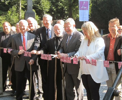 Op 21 augustus is op het terrein van de abdij Gerleve de "Baumberger Ludgerusweg" officieel geopend. Het wandelpad heeft als motto: "Wandern in der Spur des Glaubens, die der Hl. Ludgerus gelegt hat". Het pad loopt van Coesfeld tot Tilbeck (15 km westelijk van Münster).Voorafgaand aan de opening spraken de abt, de district beheerder, twee burgemeesters en de dominee en een priester van Billerbeck. Abt Laurentius Schlieker zei onder meer: "Ludger was een wandelaar uit missie". "Hij ging niet voor het resultaat, maar deed de goede dingen die op zijn weg kwamen". Heinz Öhmann, burgemeester van Coesfeld, haalde Plato aan, die de natuur zag als een directe werking van God. "Ludger is zeker in Coesfeld geweest, vermoedelijk nooit in Tilbeck. Maar de sporen van het geloof dat hij bracht zijn wel degelijk ook in Tilbeck aangekomen". Op de foto hierboven het openen van de Ludgerusweg. Helemaal rechts staat Josef Räkers, de grote coördinator van het project. |