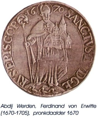 Er zijn ook een paar pronkdaalders afgebeeld uit 1670 en 1727 (zie de afbeelding rechts). Daar gaat het om munten uit Werden. Op die pronkdaalders staat de bisschop wel afgebeeld.De Muntkoerier bevat ook circa 4 pagina's uitleg over wie die Ludger eigenlijk is. Daar staat voor ons uiteraard weinig nieuws bij. De overvloedig aanwezige afbeeldingen daar, komen mij allemaal bekend voor. |